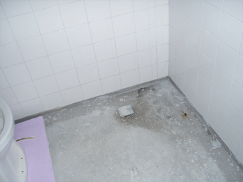 | De wanden en de vloer zijn kaal. | Alles netjes gladgestreken. | Gelukkig, daar staat ie nog. De toiletpot! |