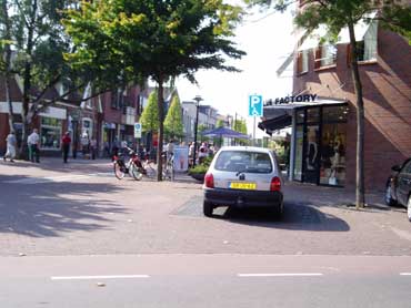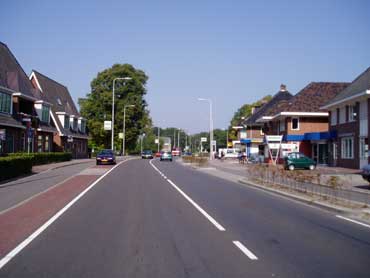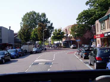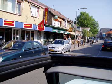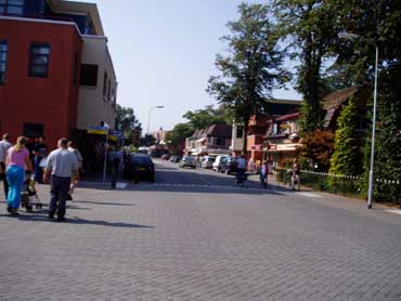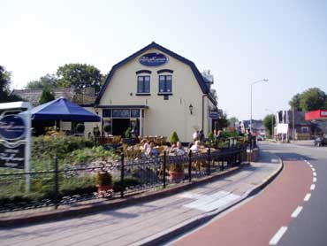 | Hier rijden we de stationsstraat in. Links zie je 'De Dorpskamer' met een gezellig terras. |